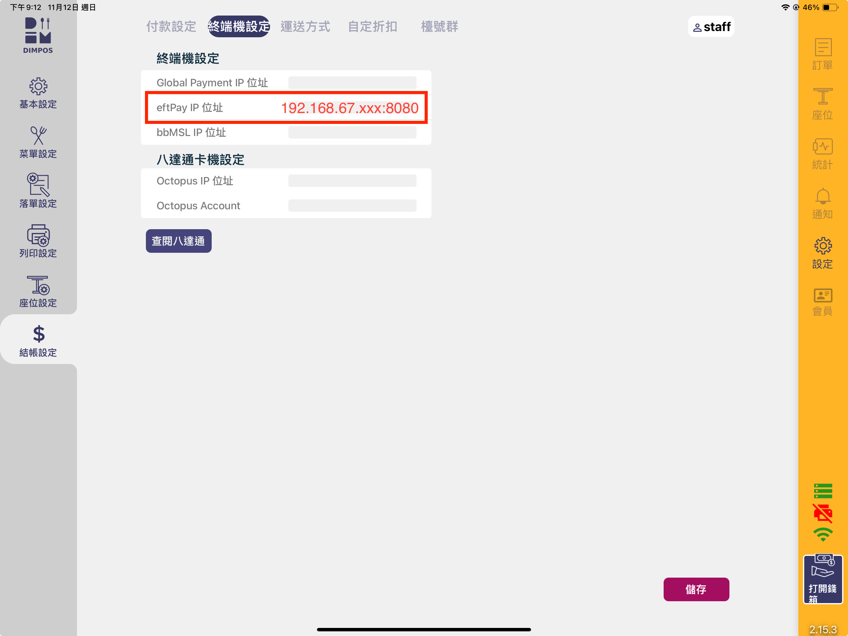 2. 在eftPay IP位址 填上剛剛EFT機的IP. 後面補上 :8080