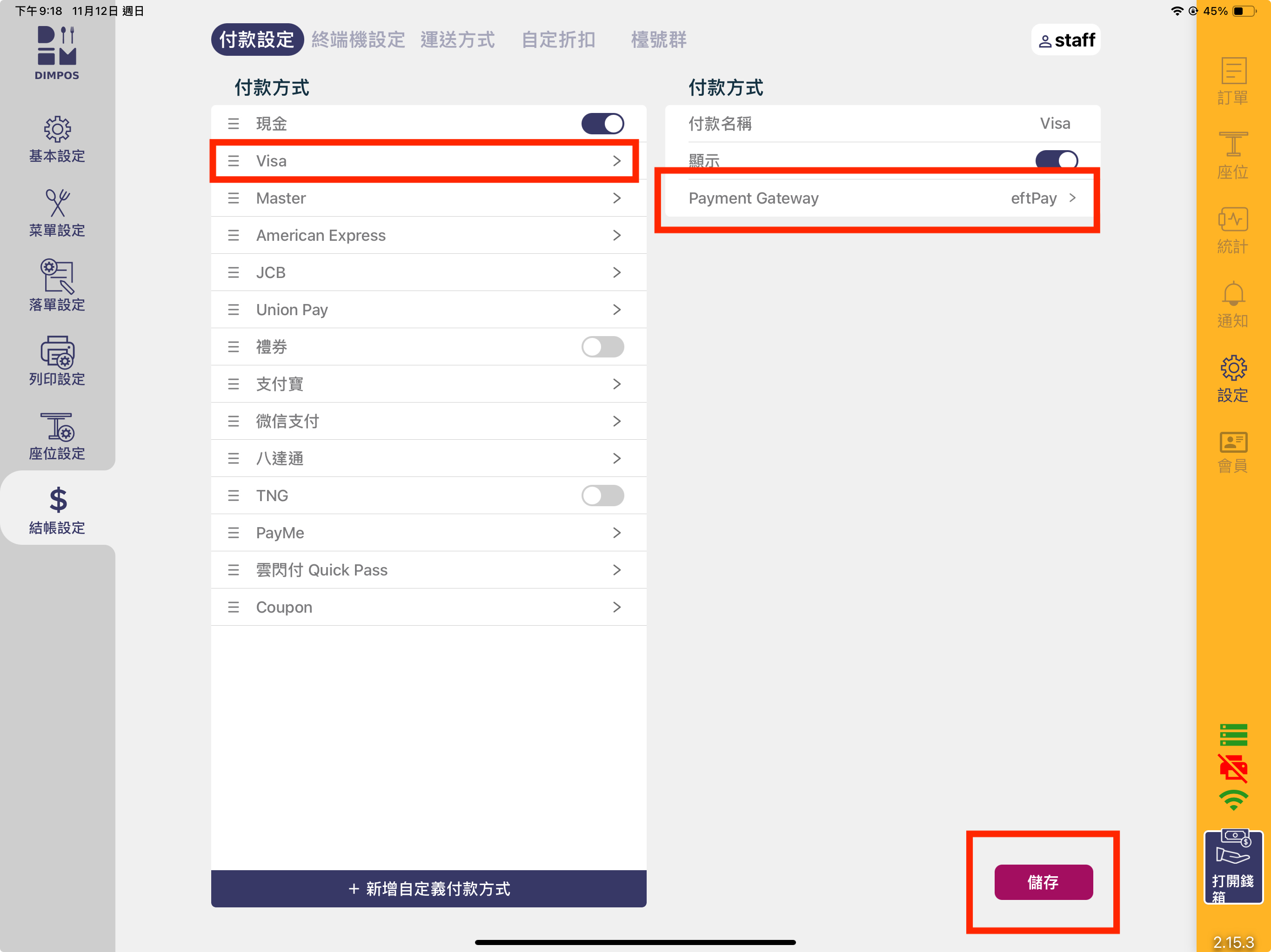 1. 先至DimPOS 「設定 > 結帳設定 > 付款設定」