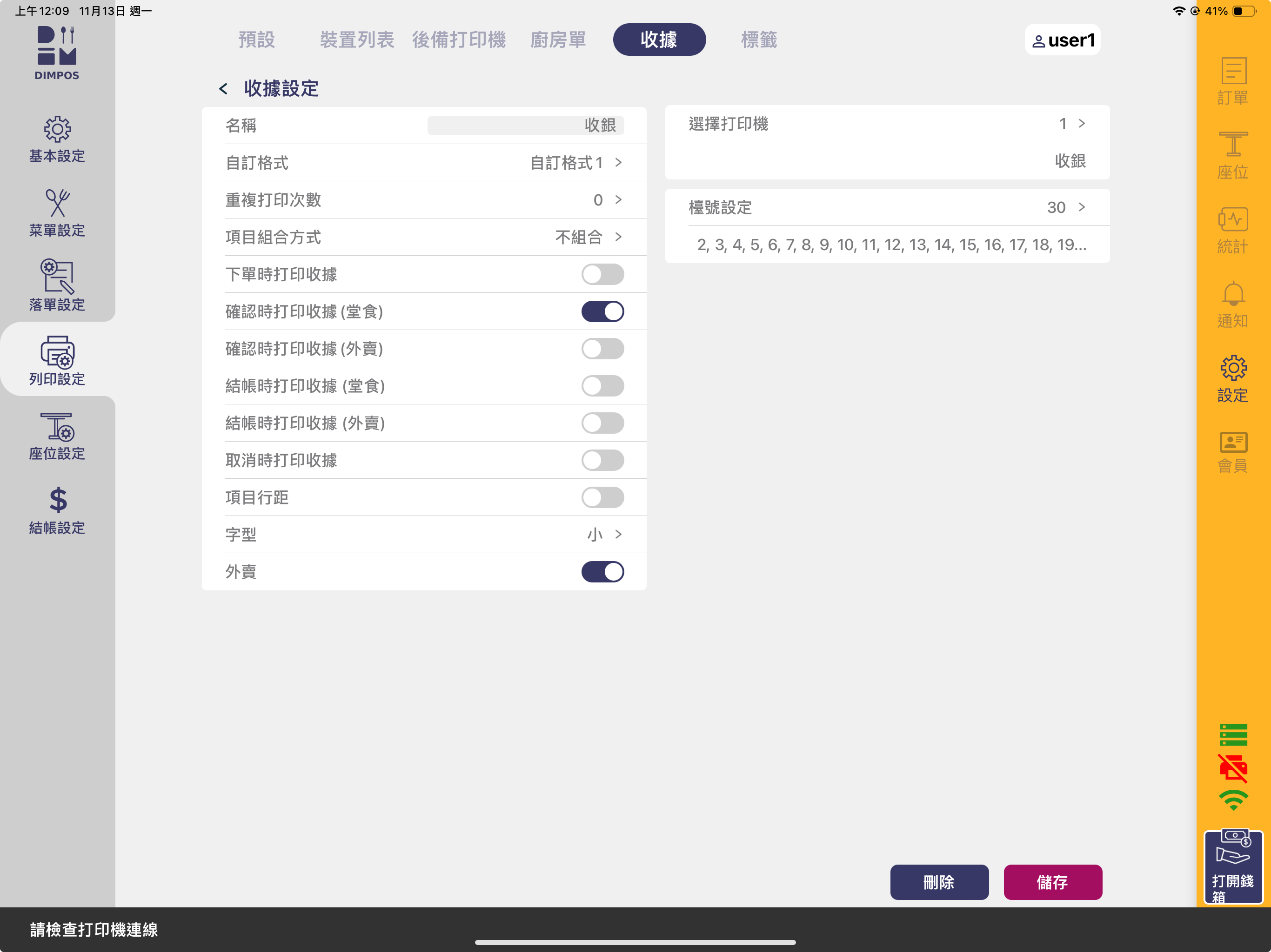 例如:設定打開「外賣」, 代表在下外賣單時會照此設定的方式出收據
