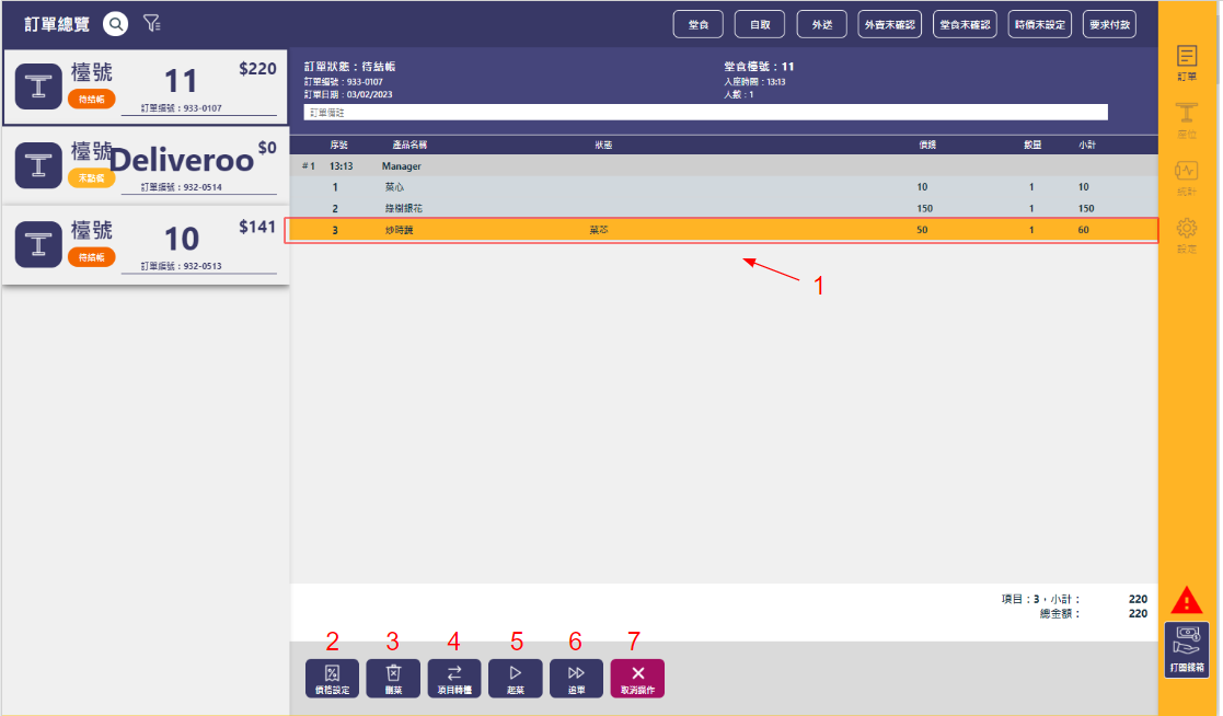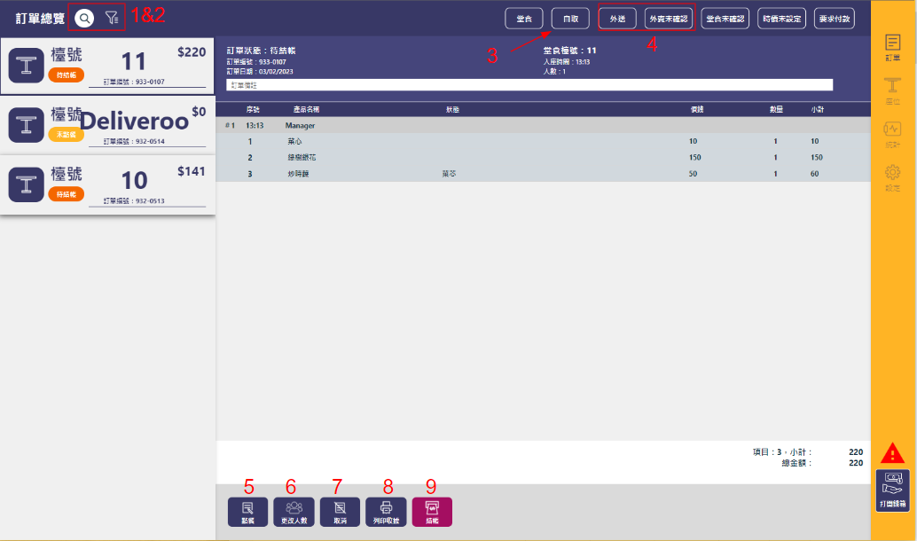 1. ➔ 可以輸入訂單編號/枱號數字來快速搜尋訂單\